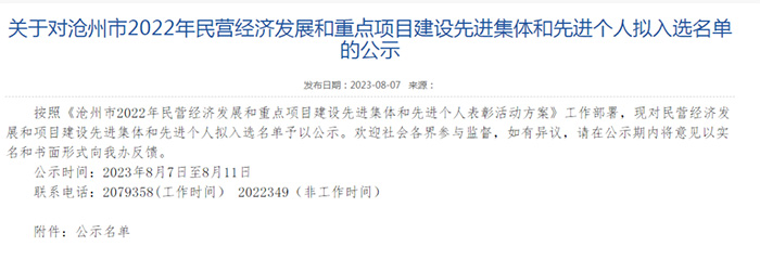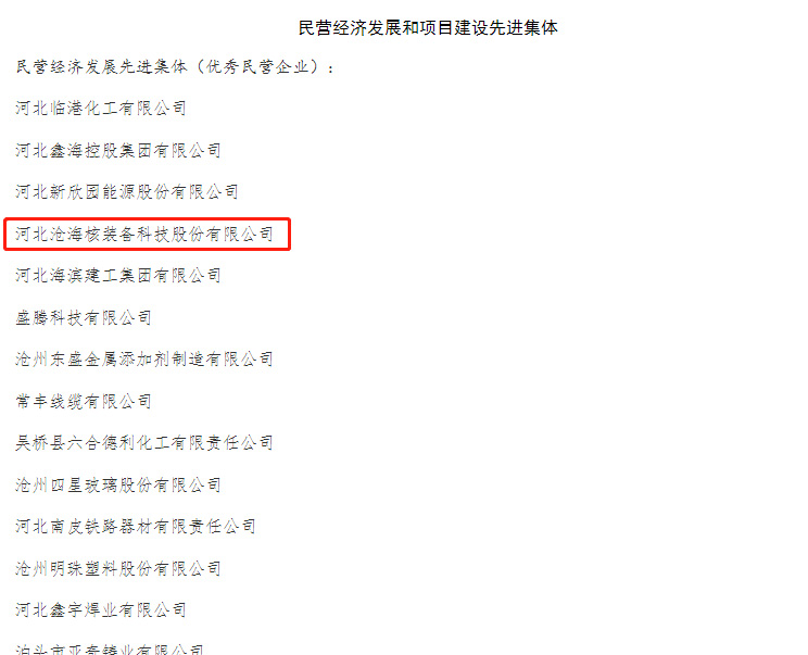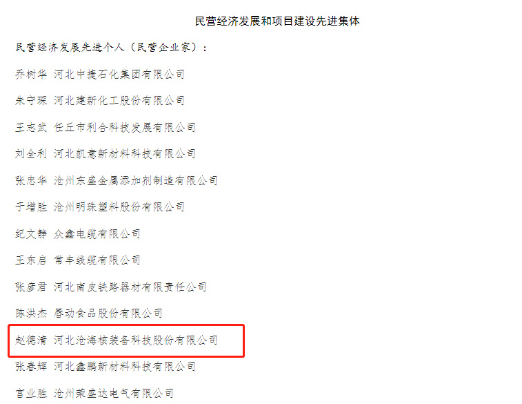 近日,河北滄海核裝備科技股份有限公司榮膺“2022年度滄州市民營經濟發展優 秀企業”榮譽稱號,董事長趙德清獲民營經濟發展先 進個人稱號。