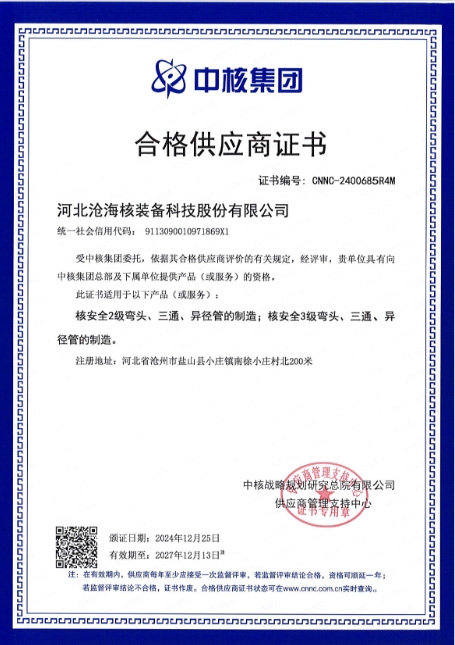 該合格供應(yīng)商證書的取得,是對(duì)河北滄海核裝備科技股份有限公司公司產(chǎn)品和綜合實(shí)力的肯定,標(biāo)志滄海核裝滿足核工業(yè)領(lǐng)域的相關(guān)要求。公司將以此為契機(jī),繼續(xù)堅(jiān)持創(chuàng)新驅(qū)動(dòng)發(fā)展,加強(qiáng)與中核集團(tuán)的合作力度,為國家核電工業(yè)的發(fā)展做出貢獻(xiàn)。